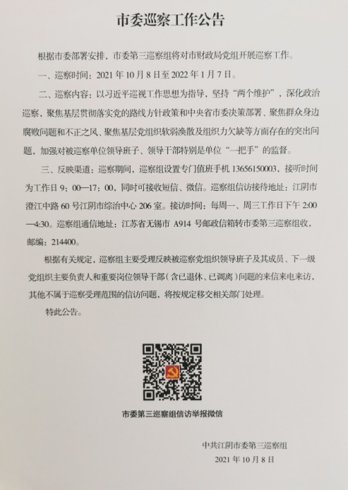 市委第三巡察組將在市財政局工作三個月左右。巡察期間(2021年10月8日-2022年1月7日),巡察組設(shè)置專門值班手機13656150003,接聽時間為工作日早9時至晚5時,同時可接收短信、微信。巡察組信訪接待時間及地址:每周一、周三工作日下午2:00-4:30,江陰市澄江中路60號江陰市綜治中心206室;通信地址:江蘇省無錫市A914號郵政信箱轉(zhuǎn)市委第三巡察組收,郵編:214400。