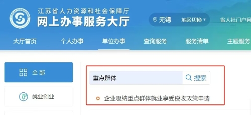 地區(qū)切換選擇“無錫”,企業(yè)吸納重點(diǎn)群體就業(yè)享受稅收政策資格認(rèn)定選擇:單位辦事—就業(yè)創(chuàng)業(yè)—企業(yè)吸納重點(diǎn)群體就業(yè)享受稅收政策申請(qǐng)—申報(bào)。