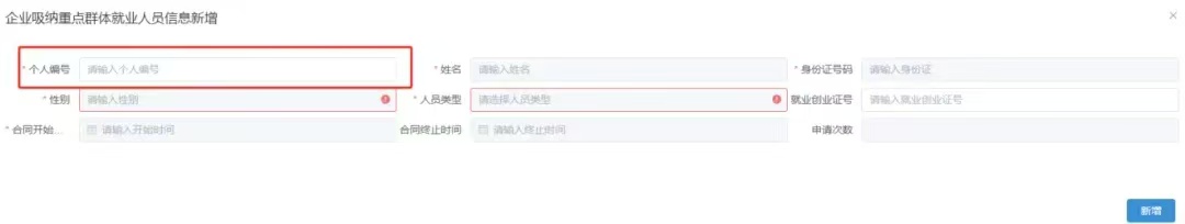 請(qǐng)注意紅色字體:如果單位有符合條件的登記失業(yè)滿半年以上的人員,在下面的列表里面會(huì)自動(dòng)查詢出來,如果是需要驗(yàn)證是否是建檔立卡貧困人口,就點(diǎn)擊右邊的新增按鈕,然后就會(huì)看到下面的模塊彈出。