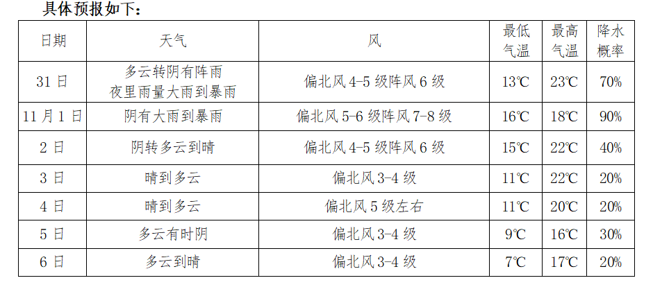 | 202424(31日后期至11月1日有明顯風雨天氣) |