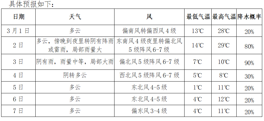 根據最新氣象資料分析,3月1-2日白天我市以多云天氣為主,氣溫明顯上升;受強冷空氣南下影響,2日夜里到3日將出現明顯降雨和大風降溫天氣過程,雨量中等局部大雨,期間可能伴有雷電、雷暴大風等強對流天氣,4日陰轉多云,5-7日多云。風力方面:1-2日風力逐漸增大,2日夜里-4日偏北風將增大至5級陣風6-7級。氣溫方面:1-2日氣溫明顯偏高,最高氣溫可達28-29℃,3日氣溫將明顯下降,24小時最高氣溫降幅近20℃,3-5日48小時最低氣溫降幅7℃左右,5日早晨最低氣溫1℃;5-7日氣溫變化平穩,最高氣溫11-12℃。