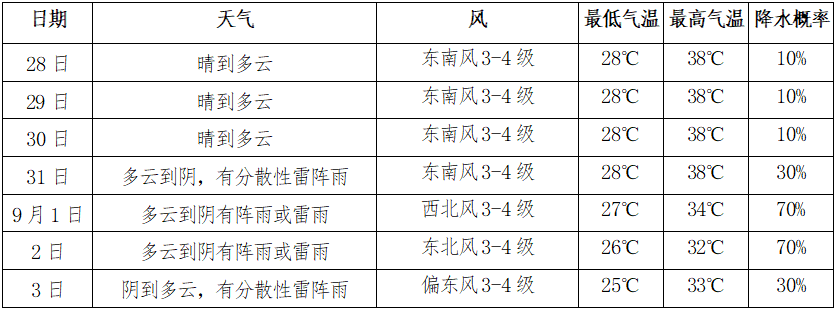 受強盛的副熱帶高壓控制,本輪高溫將持續到月底,極端最高氣溫38℃左右;9月1日起北方冷空氣勢力有所增強,副熱帶高壓減弱東退,將多雷陣雨天氣,我市最高氣溫有望降至35℃以下,連續高溫天氣將有所緩解。